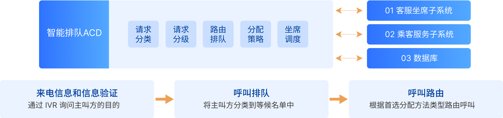 客服中心的有序運(yùn)轉(zhuǎn),依賴于智能排隊(duì)程序的調(diào)度,在有多個(gè)乘客通過(guò)不同渠道尋求服務(wù)的時(shí)候,智能排隊(duì)程序可以根據(jù)規(guī)則,生成排隊(duì)隊(duì)列,有序調(diào)度待服務(wù)乘客和客服人員(包括機(jī)器人客服)的匹配關(guān)系,讓乘客需求盡快得到滿足。用戶的呼叫在ACD交換機(jī)排隊(duì)之后,引導(dǎo)到不同的受理席,讓乘客盡量減少等待時(shí)間,由空閑資源為乘客提供服務(wù)
