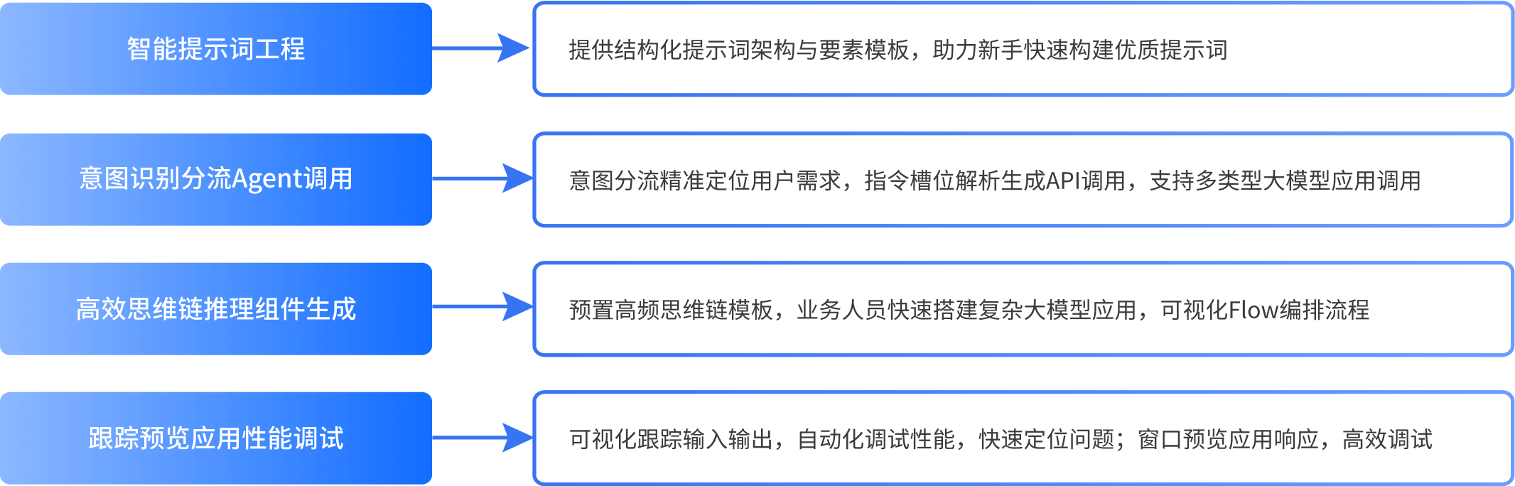運(yùn)用靈活配置與組件化策略,實(shí)現(xiàn)大模型RAG及Agent應(yīng)用的高效搭建、測(cè)試與優(yōu)化,全面滿(mǎn)足行業(yè)業(yè)務(wù)需求。通過(guò)智能提示詞工程與意圖識(shí)別分流Agent,確保高質(zhì)量提示詞構(gòu)建與用戶(hù)意圖精準(zhǔn)識(shí)別。高效的思維鏈推理組件配合可視化的Flow節(jié)點(diǎn)編排,簡(jiǎn)化復(fù)雜應(yīng)用搭建過(guò)程。強(qiáng)大的調(diào)試工具支持性能監(jiān)控與實(shí)時(shí)預(yù)覽,顯著提升應(yīng)用開(kāi)發(fā)效率與質(zhì)量。