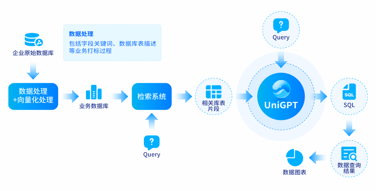 基于大模型的智能問(wèn)數(shù)功能通過(guò)深度學(xué)習(xí)和自然語(yǔ)言處理技術(shù),允許無(wú)技術(shù)背景的用戶(hù)以自然語(yǔ)言形式提出數(shù)據(jù)查詢(xún)需求,大模型能夠智能解析用戶(hù)意圖,并轉(zhuǎn)化為準(zhǔn)確的SQL語(yǔ)句以執(zhí)行數(shù)據(jù)庫(kù)查詢(xún),自動(dòng)生成并展示各類(lèi)型的BI報(bào)表,為用戶(hù)提供高效、便捷的數(shù)據(jù)分析和查詢(xún)體驗(yàn)。